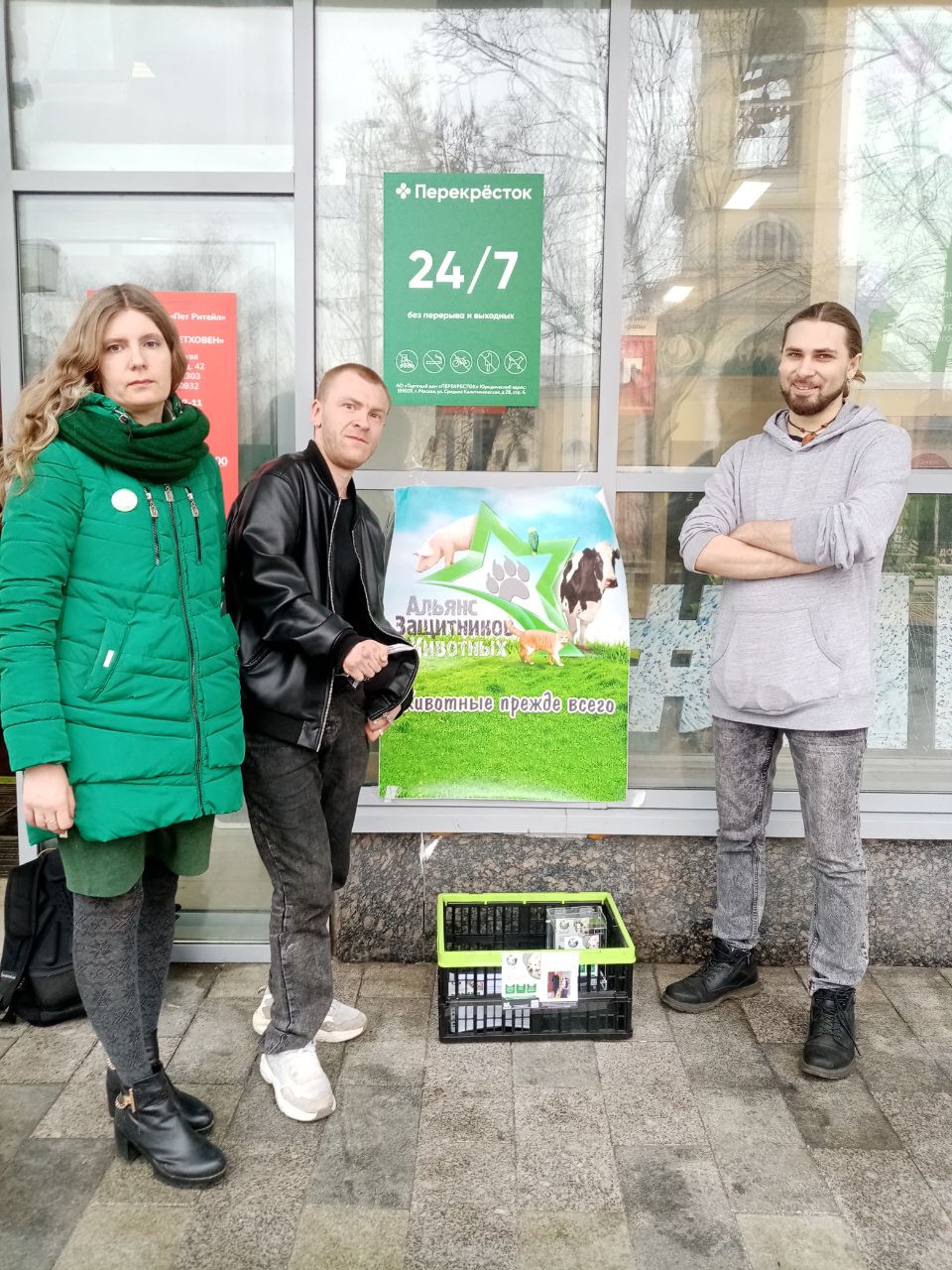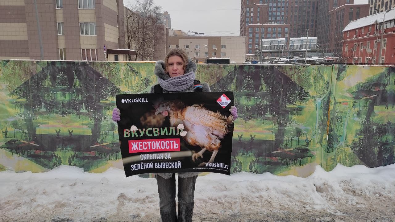 Пикетировала 28 января у Вкусвилла на жд станции Перловская Ярославской жд. Люди которые проходили мимо были очень заинтересованы, расспрашивали почему я стою, и слушали о страданиях кур на птицефабриках, фотографировали плакат.